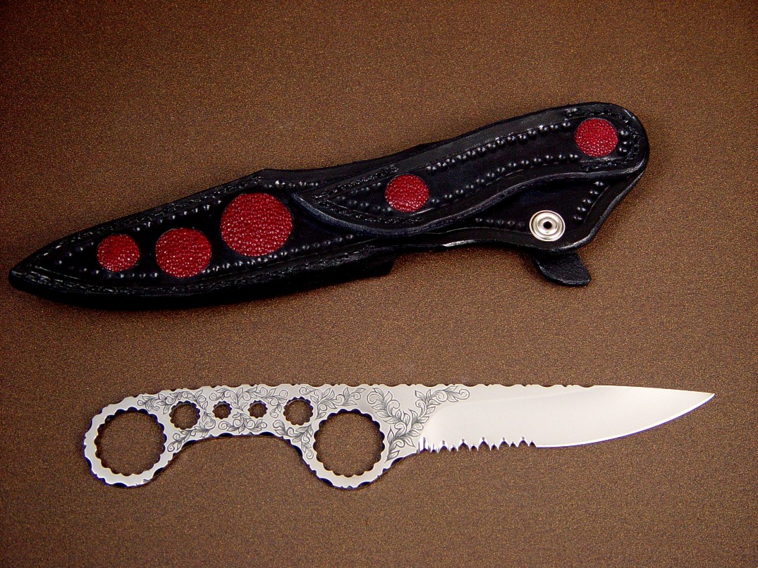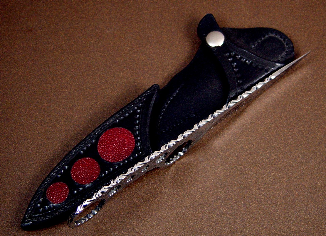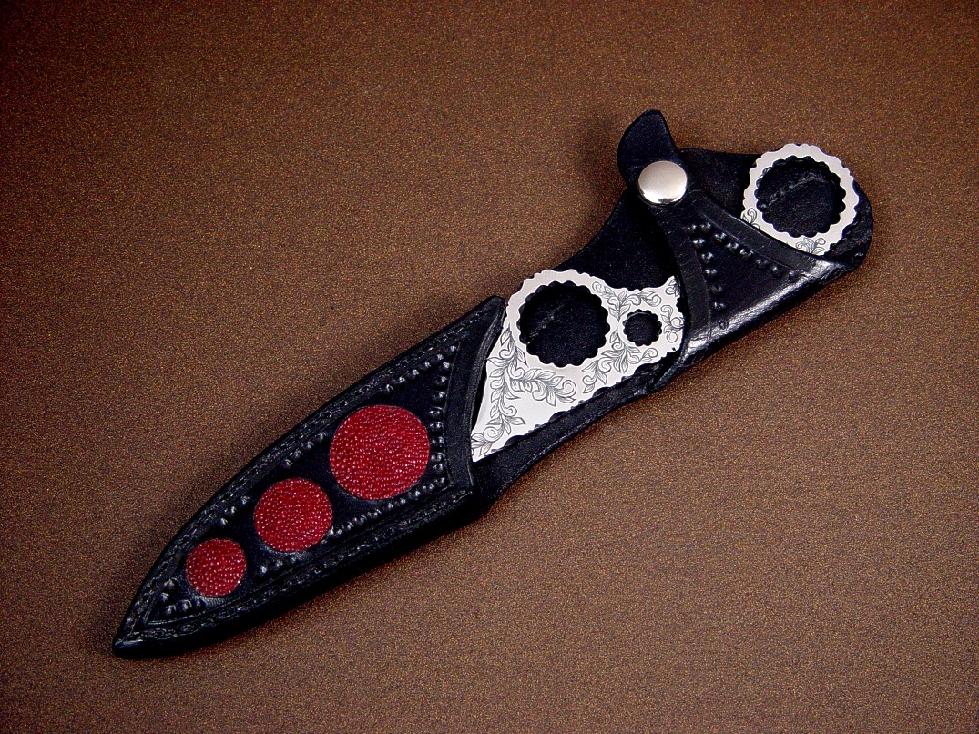 The Shank is as simple and clean as a knife can get. The steel used in this knife is very tough ATS-34 with high molybdenum and tough in the thin cross-sectional areas. This is a true stainless steel. The blade is skeletonized, that is, only the essential parts are present, in a thick and stout tang handle. The Shank has two contoured and radiused one inch diameter finger holes for security, and the blade is hollow ground and mirror polished throughout. This Shank has full filework, throughout the finger holes, tang, spine and even in the milled holes of the blade. The mirror polish on the Shank is also fully fileworked on all the flats, with a simple and clean scroll and leaf pattern. The Shank also has 1.5" of my vampire rip tooth serrations. The knife is sheathed in a clean leather sheath made of 9 - 10 oz. shoulder, which is hand-carved for inlays of red Stingray skin, front and back.