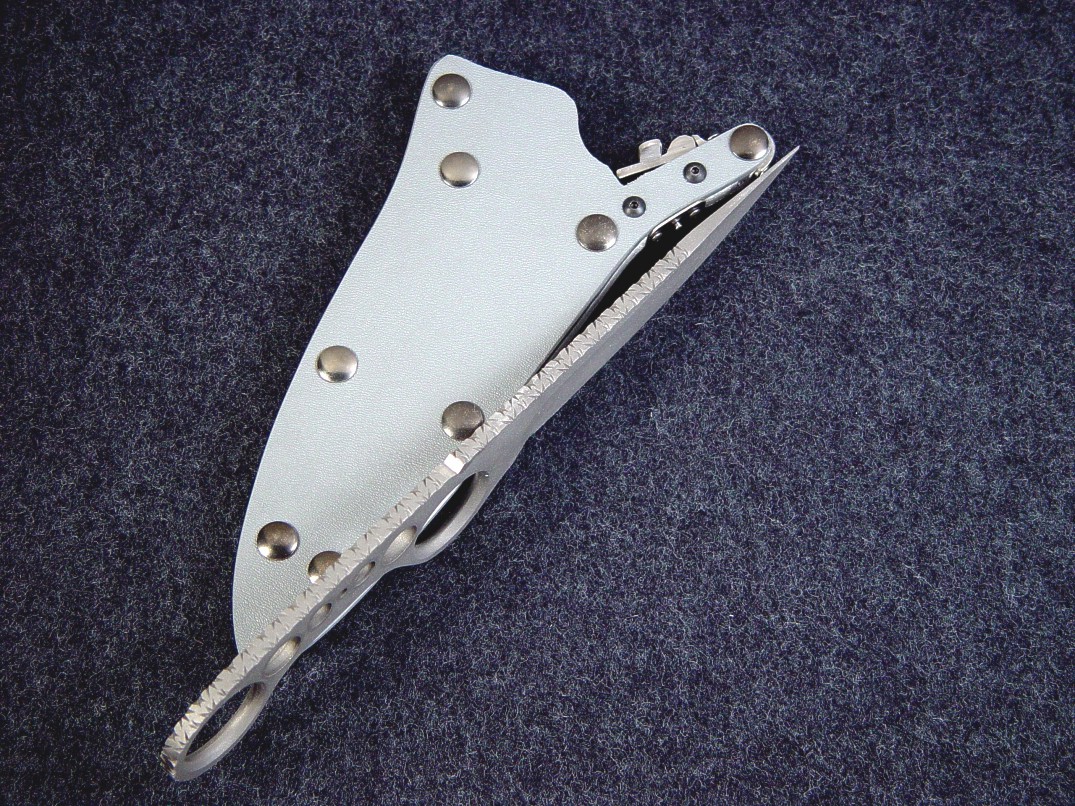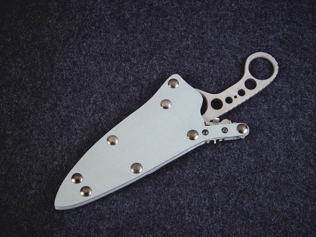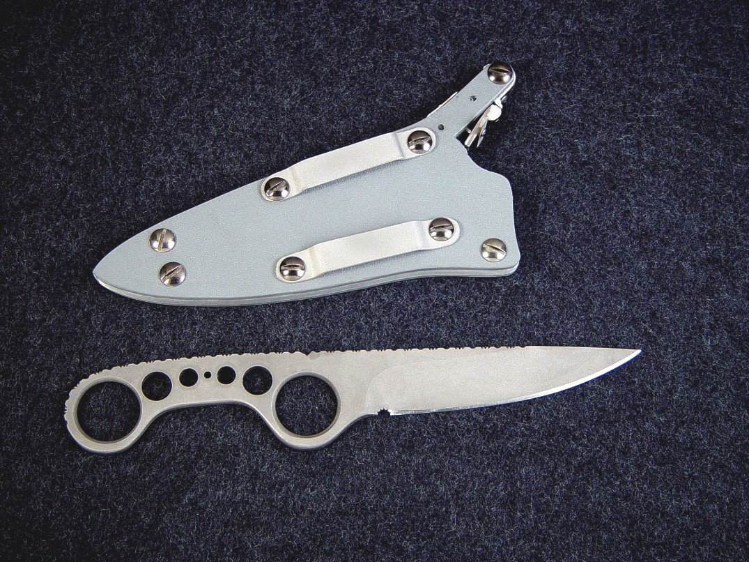 This custom made Shank is simple, clean, and tough. Made in ATS-34 high molybdenum stainless steel blade, the grind is thin, accurate, with plenty of spine for strength. The knife has full filework, a full thickness tang for support, and the finger holes are radiused and contoured for comfort of use. The clean knife has a positively locking sheath of double thickness kydex, 5052H32 corrosion resistant high strength aluminum alloy welt frame, all stainless steel locking mechanism, and blued steel Chicago screws and posts. This is a tough, reliable knife with worthwhile features.