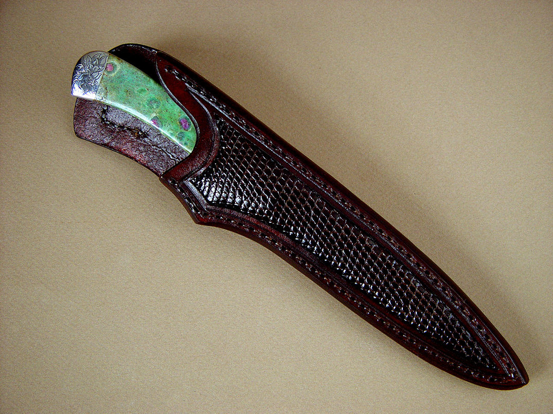 - Sheath: Hand-carved Leather Shoulder Inlaid with Lizard Skin