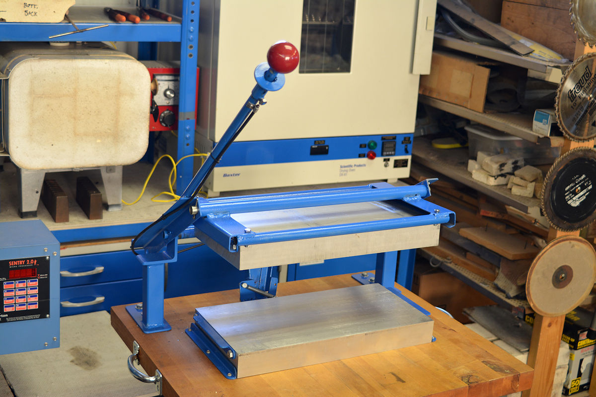 Here's the completed project, viewed from the back side. The frame of the device is in blue; it's a pivoting and balanced assembly that allows the heavy 2" thick aluminum blocks to be brought together evenly and flatly. It also has a lock built into the operation handle so that the upper block may be lifted and held in two positions above the lower block.