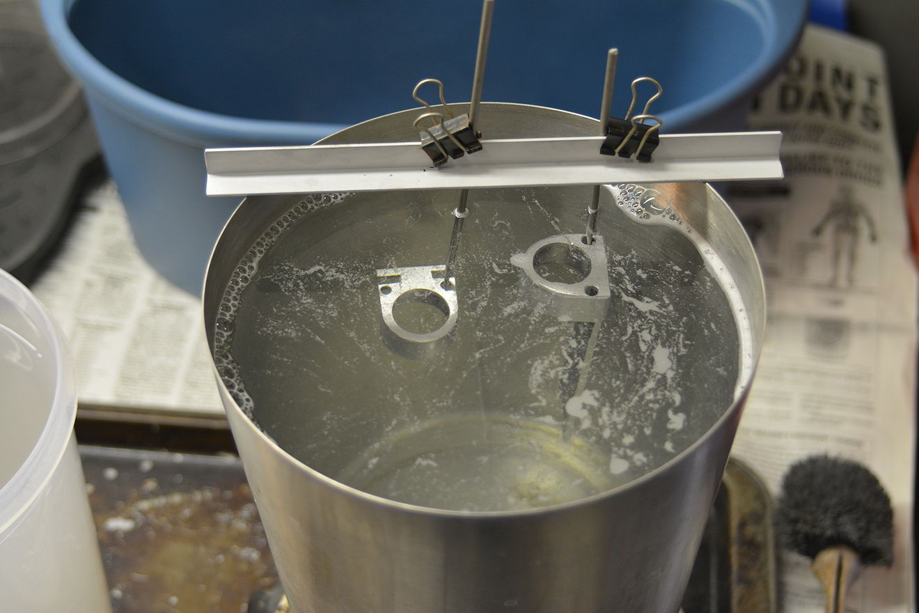 Here, I'm using a strong alkali detergent at 190°F to chemically clean the 5052H32 corrosion resistant high strength aluminum alloy that will become the frame of my HULA (Holder, Universal, Lamp Accessory) that holds my tactical flashlights on my military and counterterrorism knives. Every bit of dirt, grease, oxide, every trace of oil, and even fingerprints must be removed and this caustic cleaner does the trick. It's in a stainless steel pot and suspended with specially made holders that will remain on the pieces throughout the process.