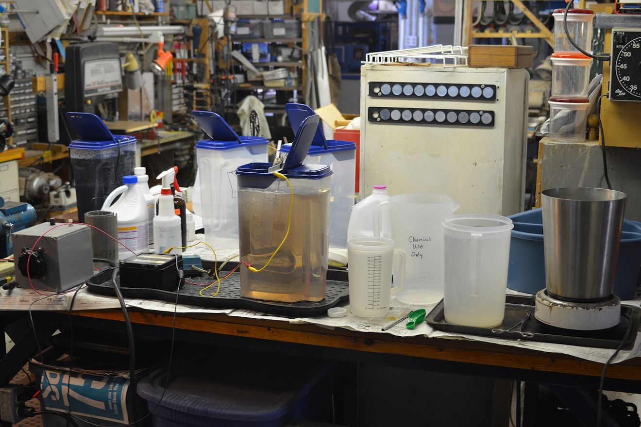 In this photo, the setup is for testing the process to work out the bugs and particulars of the line. You can see that it involves a lot of different chemical steps, involving immersion, heat, rinsing, timing, and electricity.