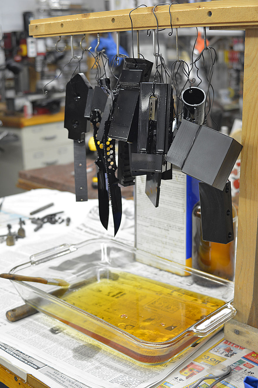 In this photo, bluing is finished, and the parts have been dipped and washed in a special water displacing oil. The oil does just that, pushes any water used in the process away from the steel on a molecular level. Then, the items and blades are hung up to drain, cure, and age for 24 hours. This allows the newly blued surface to stabilize, and completes the process.