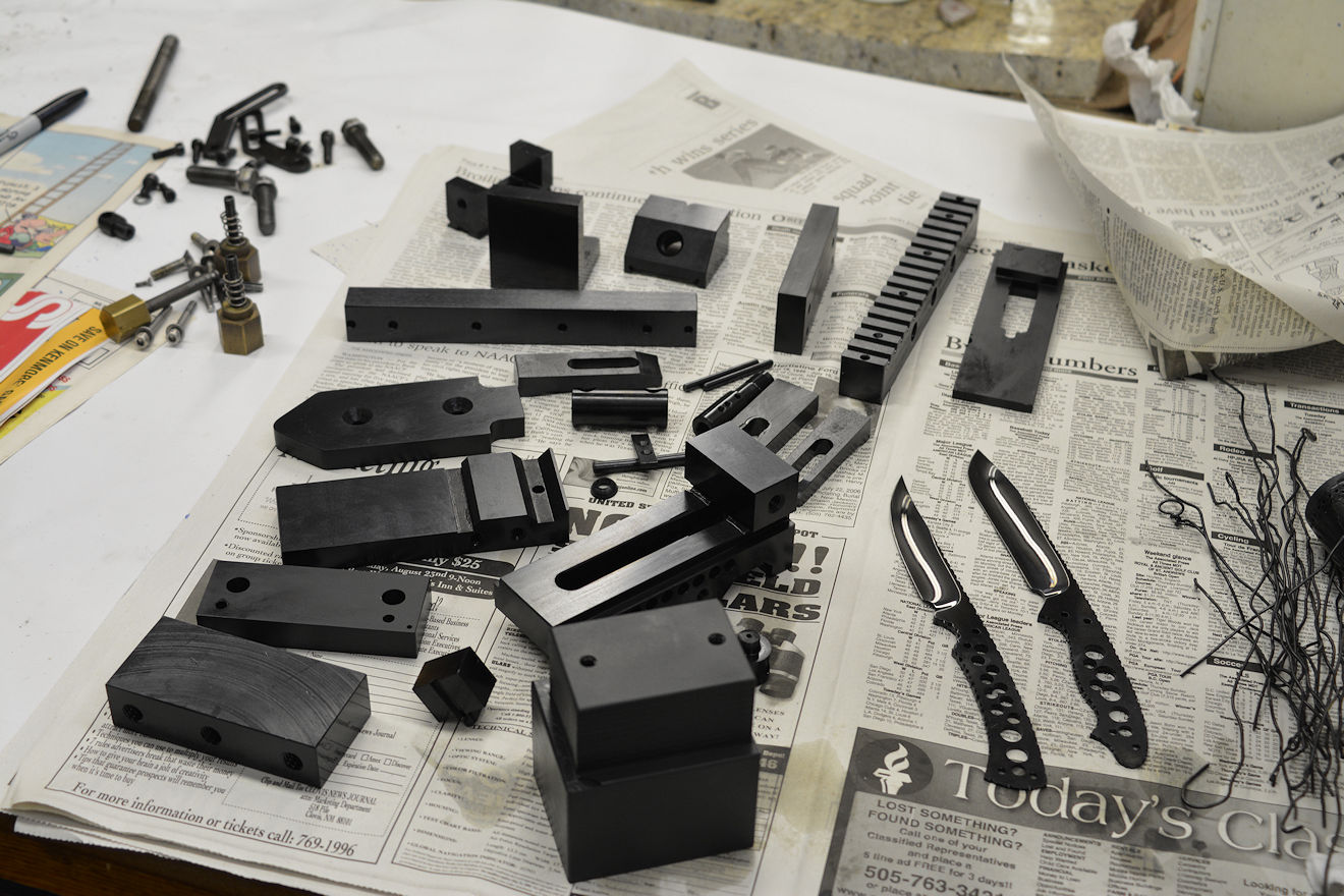 What was I making? I don't even remember; probably a part for tooling, like a tap extension or holding arbor for another tool, a tool used to make a combat sheath or accessory, or folding knife part, or something I needed. And this goes on continually in the studio. Toolmaking is a part of knifemaking, as the machinist knifemaker is continually making tools, parts, jigs, and setup devices to do another job with regularity, control, and accuracy.