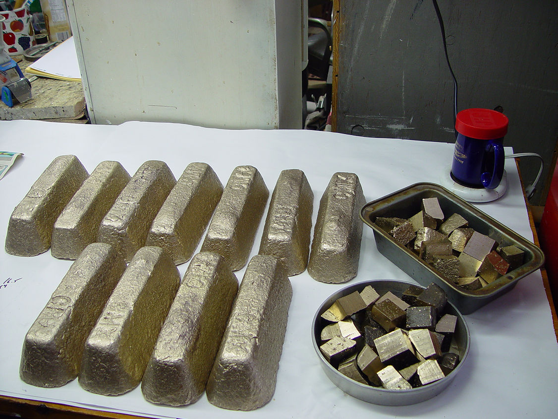 The ingots are rough, they weigh about 20 lbs. a piece, and have to be chopped into manageable sizes for weighing and placement in the melting furnace crucibles.