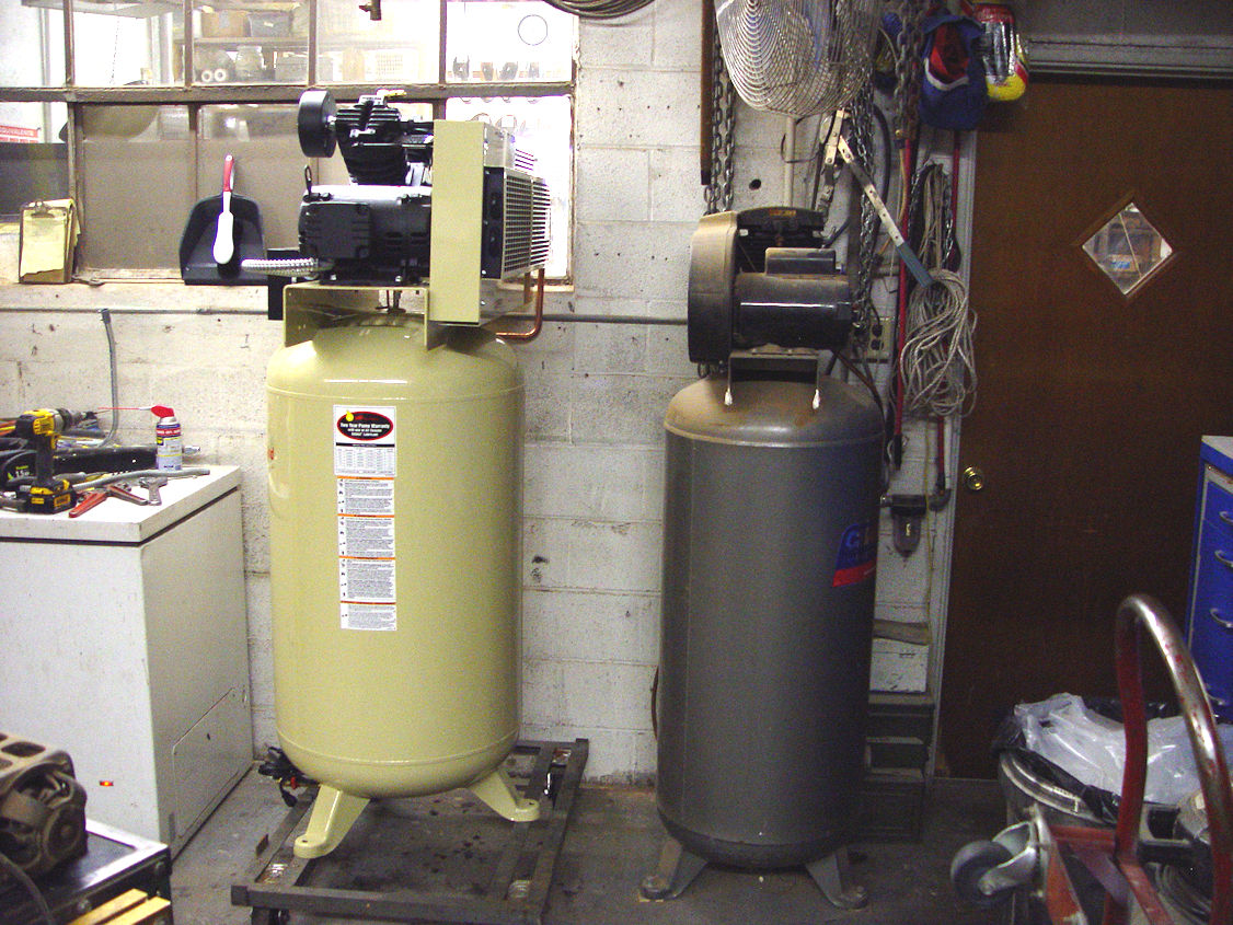 This is a photo of the compressor upgrade I did several years ago in the studio. The old compressor is on the right; it still worked okay, but could become taxed when doing heavy blasting while other air tools were in operation. It was starting to leak a bit around the rings and valves, and is a single stage unit that would get fairly hot in continual operation. The heat means more fluid and condensation in the line, and a heavier current draw as the motor has to work harder to keep up. Plus, the technology of the old unit was dated and less efficient than the newer one.
