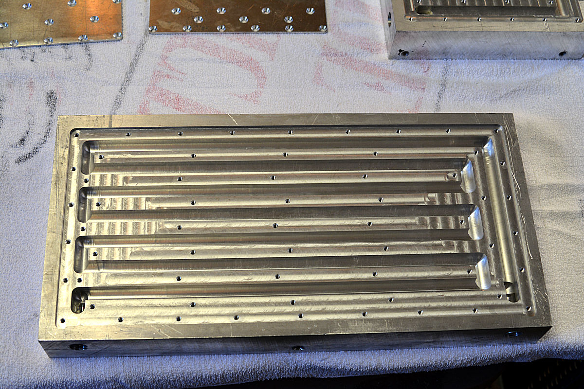 This block is 2" thick and 9" by 18" in size. It's a heat exchanger, and the passageways are where the coolant flows during operation. The block will be covered with a thick plate sealed and secured by 60 machine screws. The purpose of this piece is to carry away heat during multiple pressure block quenching of knife blades, so that the aluminum remains at a fixed temperature for efficient and effective quenching.
