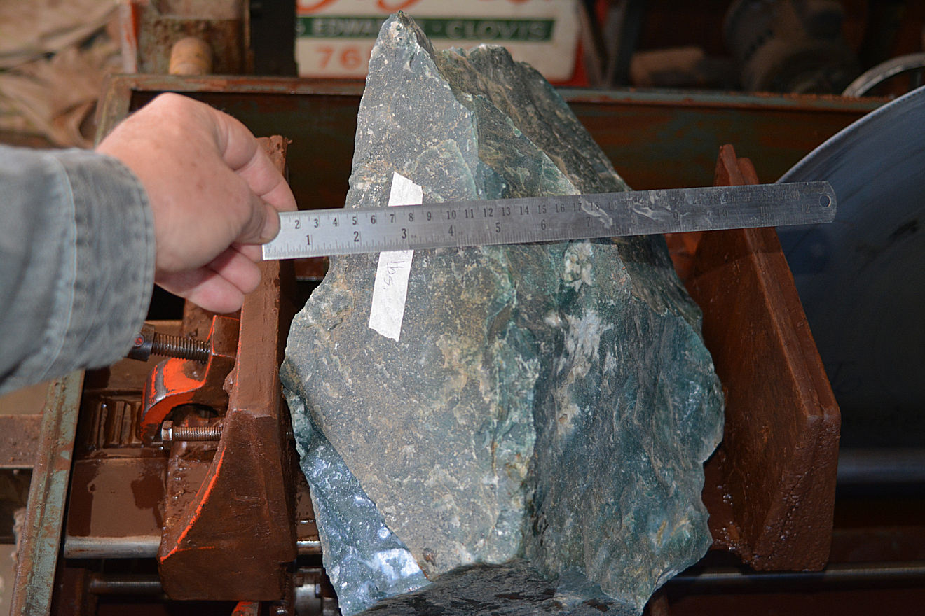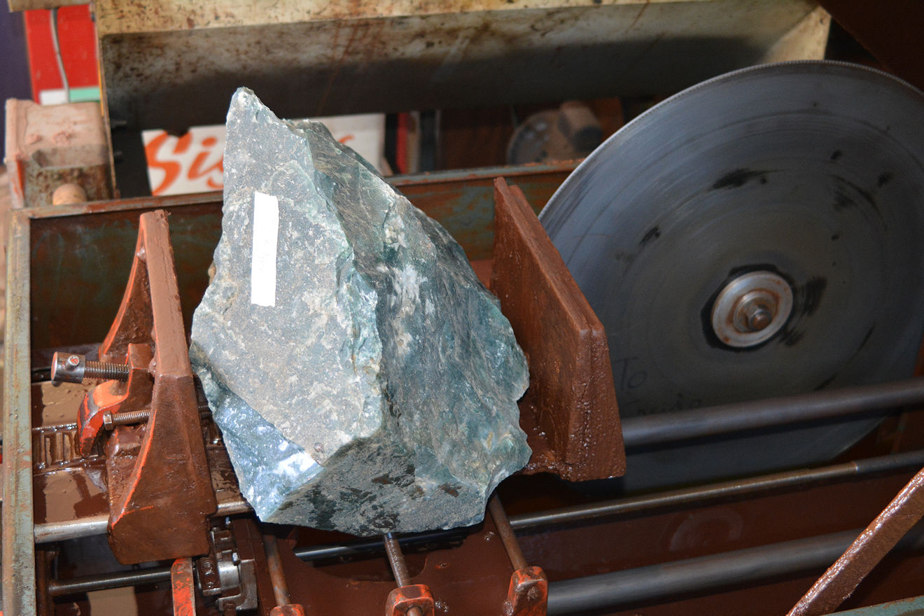 Gemstone handles start with a saw. Here you can see a piece of rough rock in the vise of the saw, ready for blocking, followed by slabbing. Orientation is a critical part of choosing the best face of any rock, and if slabs (slices) are needed, this must be chosen carefully. Not all rock looks good from all angles.