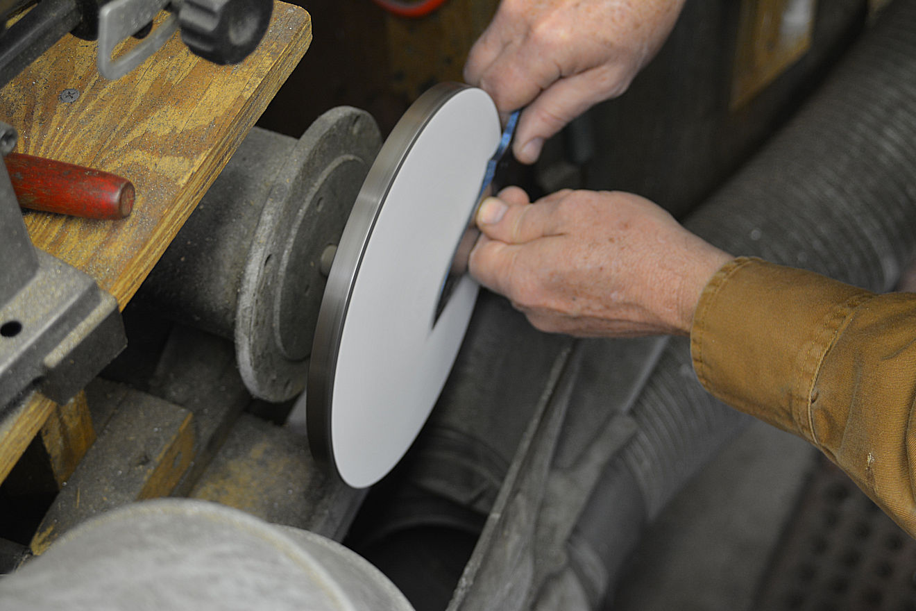 After the blade is hogged close to the profile and the scribed line, it's important to go over the grind to make it perpendicular to the blade flat. This allows a more accurate shaping, grinding, and finishing of the entire blade, particularly the periphery. There are a lot of technical reasons for this, and I'll probably detail them in my book, but what is important is establishing a square, accurate profile at this point.