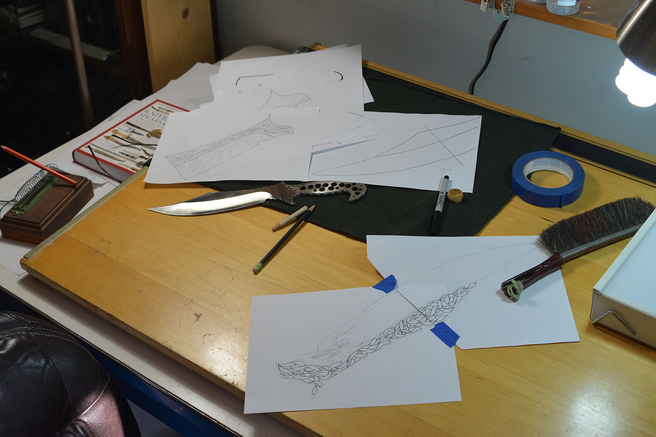 Engravings on knife blades start with drawing. Each artist has his own method of drawing, and if the maker is also the engraving artist, the piece will, by necessity, flow from the singular concept and ideas of one artist. The piece takes on a depth of uniformity, rather than a work that's been "embellished." It's the way I choose to have my work created.
