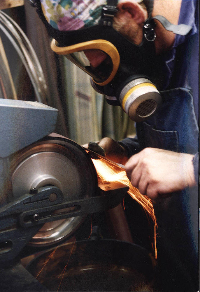 I'm going to go on a little here about this photo. You can see in the lower left corner of the photo a big red paddle button that is marked "off." This is the grinder control. Usually, the control box is mounted above and behind of the machine so that the dust it creates does not destroy the electronics. It's a good idea to have the stop switch very close at hand in case of emergencies. You'll notice also the garb of your favorite knifemaker. Heavy clothing, an apron, and a do-rag, are all cotton. This is because cotton won't propagate flame like nylon, polyester, or other manmade fibers. Note the half-mask respirator. More than a dust mask, it's a chemical cartridge filter that can block organic solvents, vapors, or other dangerous chemicals that may become airborne, as well as all fine particulates. The safety glasses are heavy framed and plastic lens types, but there are no gloves. While this may seem counter intuitive, gloves would remove the fine sensitivity needed to accurately grind blades. This may not matter much in profiling, but when grinding, gloves don't work. Note in the background another grinder; a production knifemaker needs several of these machines for various setups.