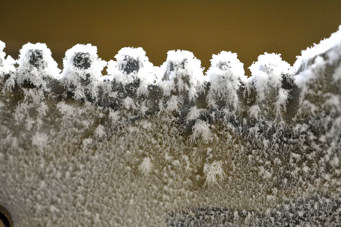The photo is about a 7 power enlargement of some serrations on a CPM154CM powder metal technology high molybdenum martensitic stainless steel hypereutectoid tool steel blade, after hardening and a 40 hour soak in deep cryogenic range. It's warming up to room temperature, and after it warms a while, it reaches the condensation range of the moisture in the air, so ice crystals start to grow and form on the steel. These are tenuous, feathery structures that only last a few minutes before melting and disappearing. More about Heat Treating and Cryogenic Processing of Knife Blade Steels.