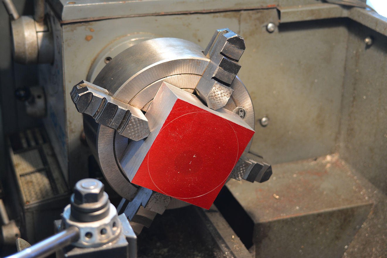 While this lathe doesn't perform much of the actual knifemaking process, it's used for plenty of other support. I use it to create my accessories for the tactical knives, tooling, setups, and hardware. Here, I'm milling the bore of a block of aluminum that will become a new contact wheel for the belt grinder. Yes, I make my own contact wheels.