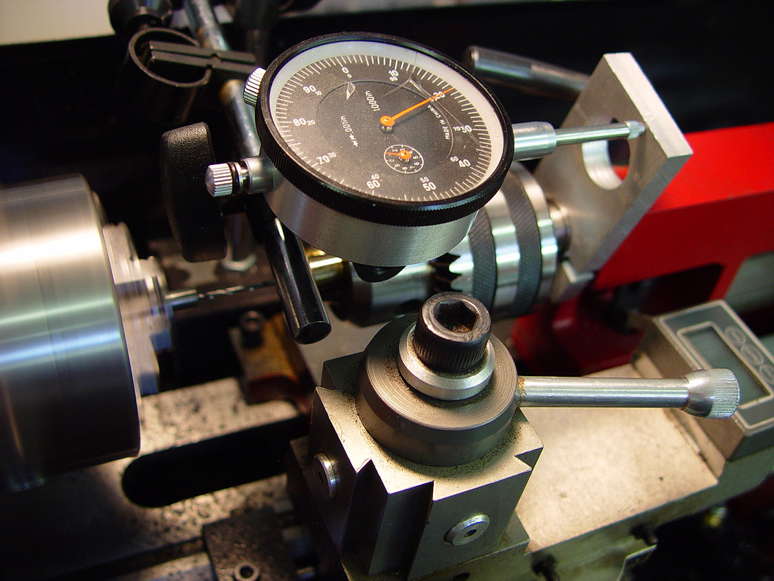The setup is simple: accurately measure the depth of a hole drilled in a round stainless steel pin on the lathe. A piece of squared aluminum stock is clamped to the neck of the tailpiece arbor, and the dial indicator is magnetically clamped to the tool base. The drill chuck in the tailpiece is advanced, and the depth of the hole is indicated.