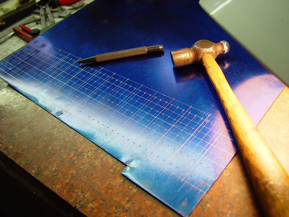 I'm using a small centering punch and ball peen (machinist's) hammer to punch centers of all the holes. It's a heck of a lot easier to drill all the holes in the sheet metal before cutting and trimming the pieces.