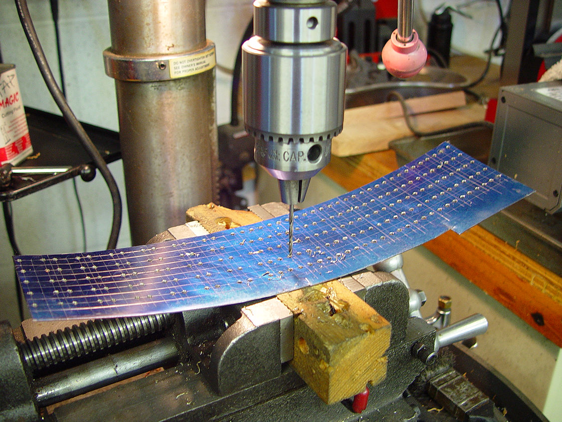 The reason the plate is curved is because I'm drilling so many holes and the drill bit is pressed into the sheet metal backed by a fairly soft wood. So each action of drilling is also forming, and slightly bending the sheet metal upward. No matter; the plate will be flattened and then all of the tiny plates will be trimmed apart.