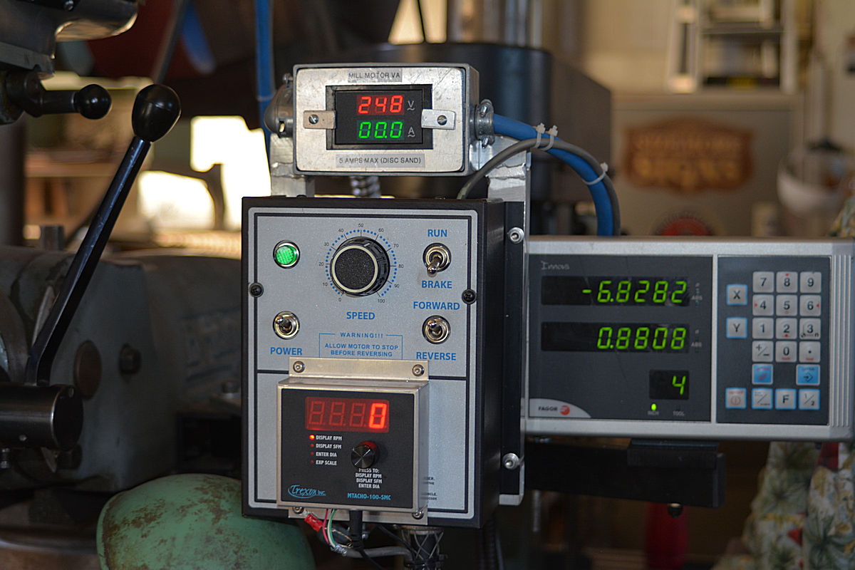 The photo at the right is of the control package for my Bridgeport knee milling machine. While the mill is a standard fixture in all small and large machine shops, what you see here is not. It's an evolved hybridized approach, a common theme that you'll see repeated as this page and discovery goes on. I've converted the milling machine drive system to all direct current, which is a much more efficient, powerful, robust, and economical way to drive the machine. At the top of the photo is a VA meter, measuring voltage and overall amperage of the incoming feed to the machine, so that I know how much juice is being used to feed it, so I can regulate and adjust loading depending on what the machine is being used for. Below that is the main box of the DC controller, which controls speed, direction, and even brakes the mill so you don't need to use the hand brake (yes, there is a hand brake on the milling machine to aid in speedy tool changes). Mounted on the front of the controller is the RPM/SFPM tachometer, which measures and indicates both rotational speed and the surface speed of the cutter or device. Alongside is the X-Y DRO (Digital Read Out) which indicates the absolute position of the cutter in relationship to the table. This device alone would fill a book on its capabilities, and (of course) I'd like to upgrade it to a X-Y-Z DRO in the future!