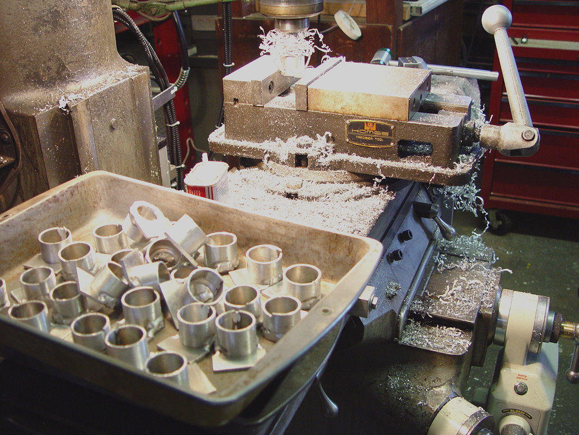 In this photo, I'm working up a batch of them, a dozen or so, and have formed and welded the front and rear cups and am milling the centers to be completely concentric and to hold the specific flashlight they will accommodate. More about HULAs