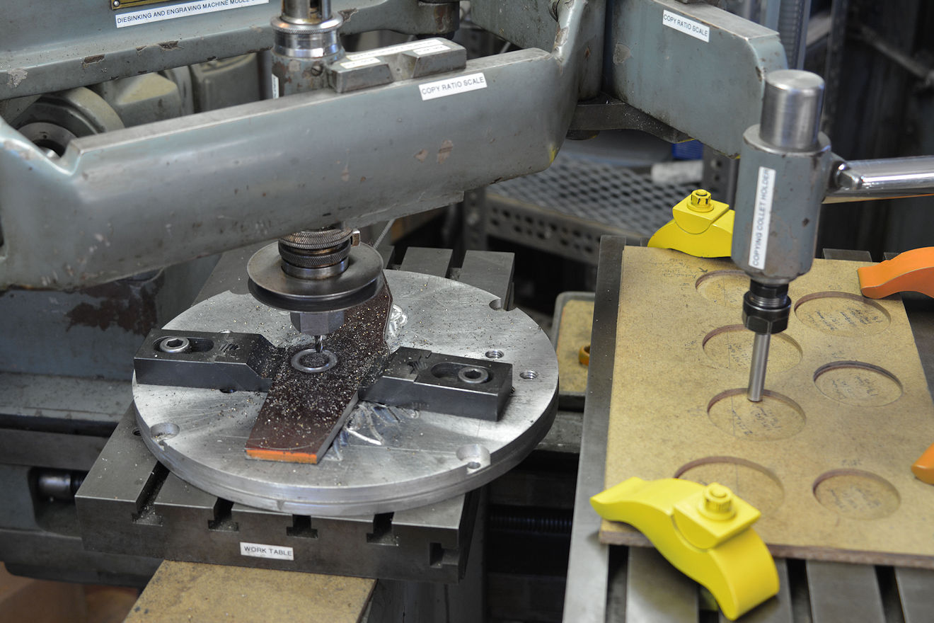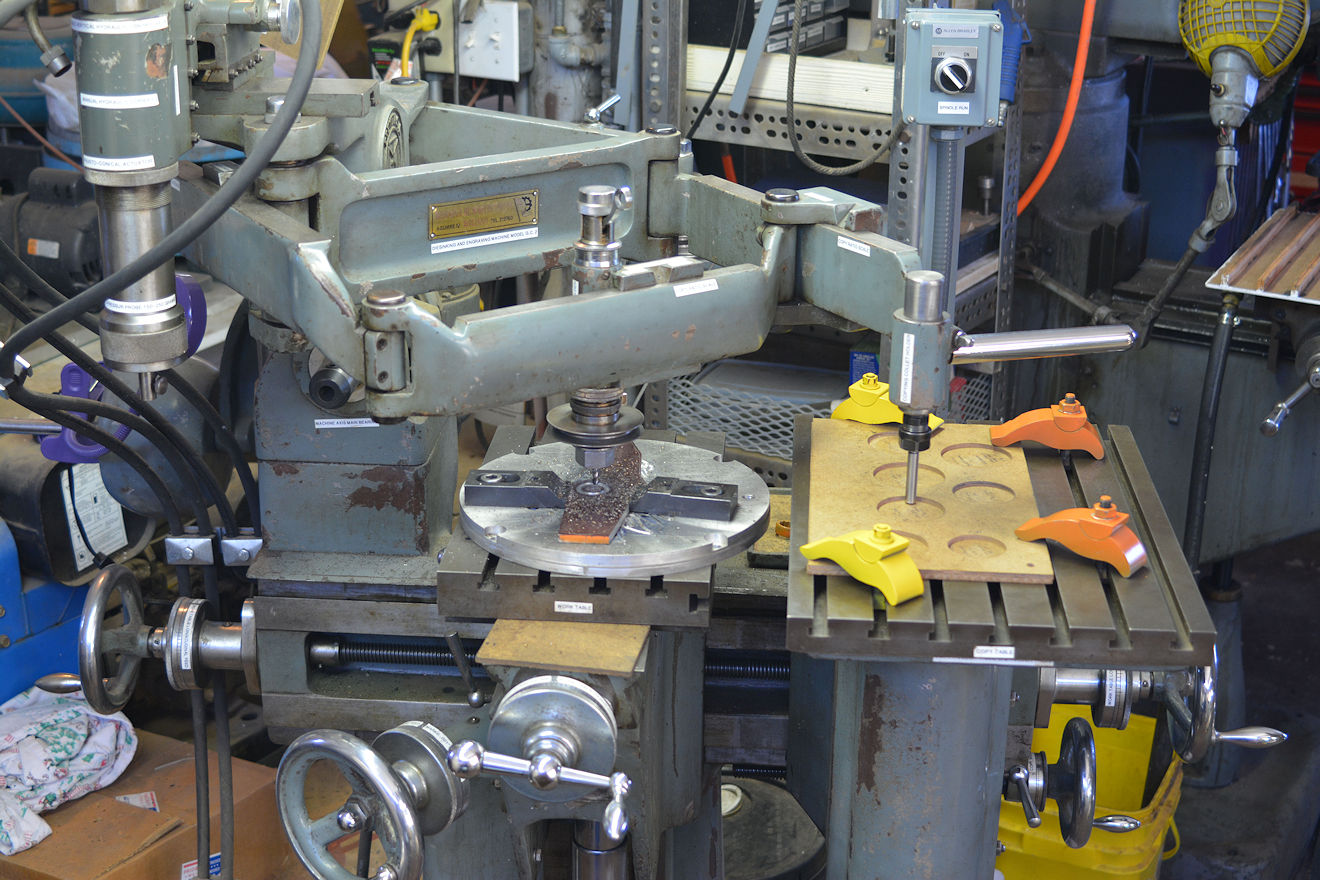 In the old days, I would drill these holes. This was no easy task. The final dimension would need to be 1" in diameter or larger, a pretty big hole. The way to do this on a standard drill press is to first locate and punch the center, then drill a starter hole with a combination drill/countersink or a spotting drill. This is followed with a pass through of a drill about 1/4" in diameter, and then a pass with a 1/2" diameter drill. The reason to drill with successively larger drill bits is because the web of the drill bit (the absolute center core) does not cut, it simply scrapes and at a relatively low speed. When it gets to larger bits, that web is pretty big, and it takes plenty of force to displace the metal; thus, multi-step drilling. But the final bit is really big, and most drill presses won't accommodate this size of drill bit. So the large drilling is best done on a milling machine (or knee mill), which has the torque and power to literally drive the table into the bit. But still, this takes multiple setups, and no fine tuning of the size of the bit or the final hole is possible. This is why currently, I've moved to my Pantographic Engraving and Die Sinking Milling Machine to do this work. Note that the pattern that controls the hole size is on the right table (called the Copy table), and the work is clamped to an aluminum tooling plate on the left table (or work table). The movement of the spindle (and cutter) is done with the horizontal shiny handle on the copy table, with a copy bar following the template beneath it. More in the next photo below.