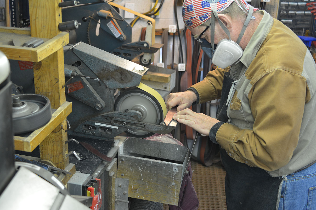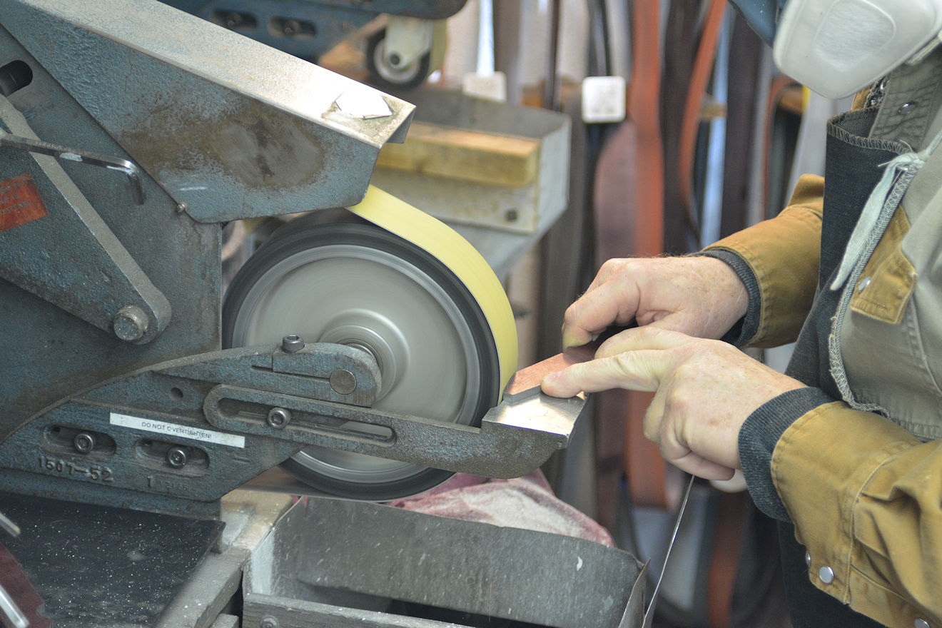 Grinding a knife blade is a common task in the knifemaker's studio and shop, and before grinding the hollows in the blade, a short bevel of material should be taken off the cutting edge so that the belts are preserved by not having to encounter an extremely sharp angle of steel that would strip abrasives off the belt. So the lead-in bevel is created with an old, worn belt to change this geometry. The old belt is a bad cutter; it creates plenty of heat, and then plenty of spark, which is burning pieces of metal flying through the air and contacting a lot of free oxygen, continuing the burn.