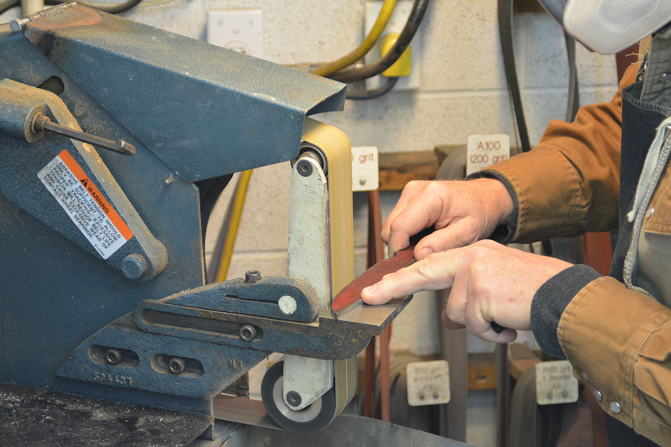 A lot of makers put tool rests on horizontal grinders, and they do it because it helps them keep the grind square an perpendicular. I've practiced so long with so many (thousands) of blades that that's not an issue. The drawback of the tool rest is that it will force the work to be done on only one small area of the 2" wide belt, right above the where the flat tool rest plate sits. This will wear out a grinding belt in a hurry. When grinding offhand, though taking plenty of skill and practice, the hand can move up and down the belt, utilizing all of the abrasive surface, shortening the cutting time, lowering the point contact heat, and lengthening the belt life. There is a definite technique to keeping this cut perpendicular, and again, I'll probably go into it in my book.