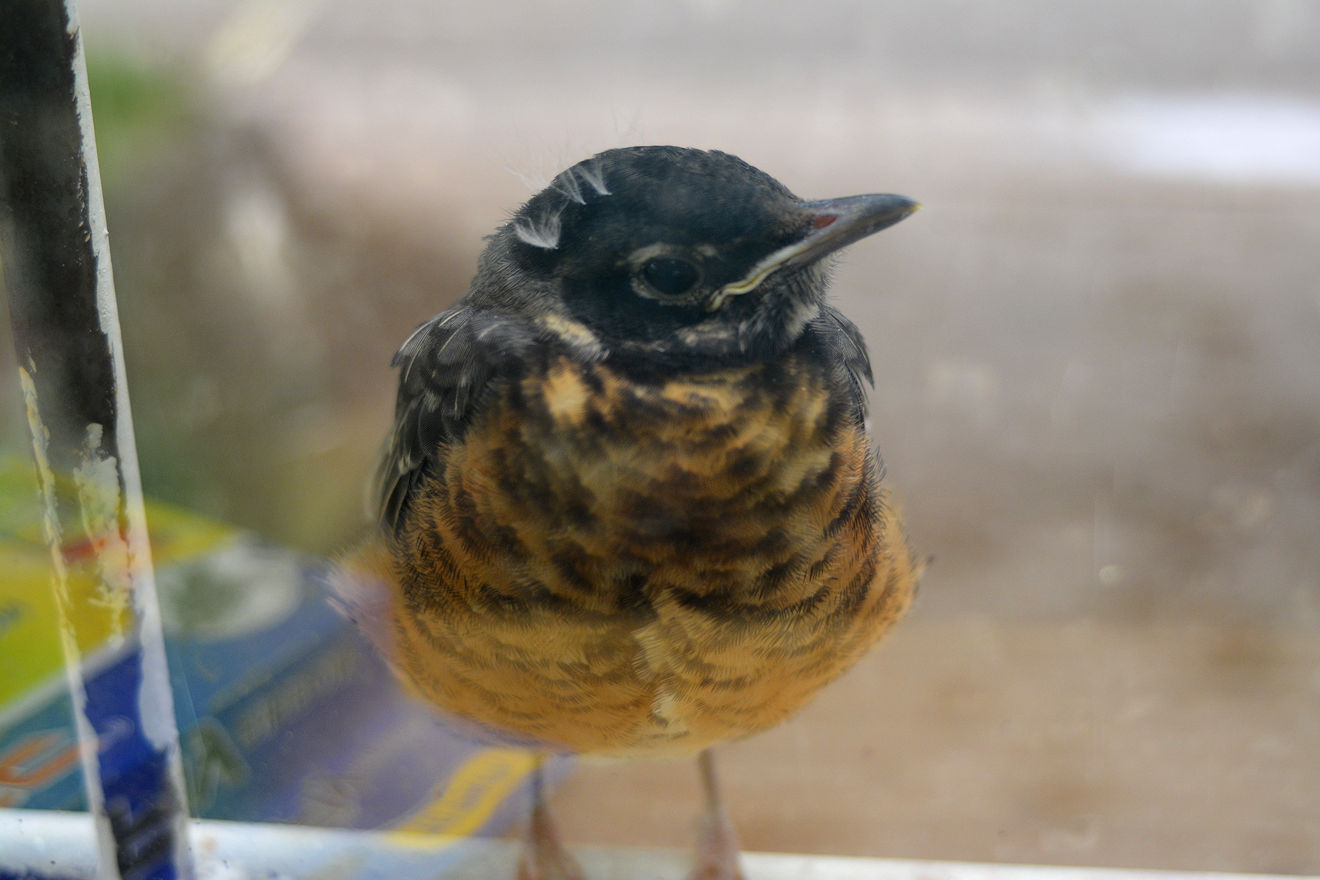A young robin perched on the bars at one of my shop windows. He's curious, new to this world, and wonders why human beings spend time in buildings, facilities, and are busy at tasks when they could simply browse the yard for worms and seeds and late summer berries.