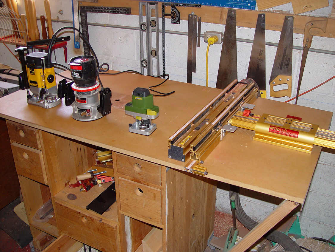 The table I've adapted for the extremely high accuracy of Incra brand fence and components, you can see them some of them in the central hole of the table. These are sophisticated alignment devices, clearly capable of machine tool accuracies, down to .001" in wood!