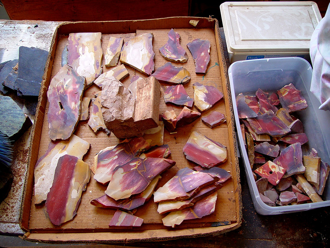 Mookaite jasper is a very hard, very tough rock from Mooka Station in Western Australia. It is technically a chert. Chert is a microcrystalline or cryptocrystalline sedimentary rock material composed of silicon dioxide (SiO2). It occurs as nodules, concretionary masses and as layered deposits. Chert breaks with a conchoidal fracture, often producing very sharp edges. So this jasper could be used to make spear points, and it's certainly tough enough! This chert is not just a sedimentary rock, it's also a fossil, made of billions upon billions of radiolaria, or radiozoa, which are protozoa from the Cambrian period, about 500 million years ago. These deposit of their remains formed into muddy silt, and their remains and the remains of other creatures were replaced by silicate-bearing minerals that give the striking colors and patterns. The sediment fossil was then subjected to geological process, further changing the structures. This is a beautiful rock and takes a stunning, glassy polish. Knives I've used this material on are the Macha and the the Bulldog. Seeing this photo makes me want to make another knife with Mookaite, and it's an addiction I enjoy!