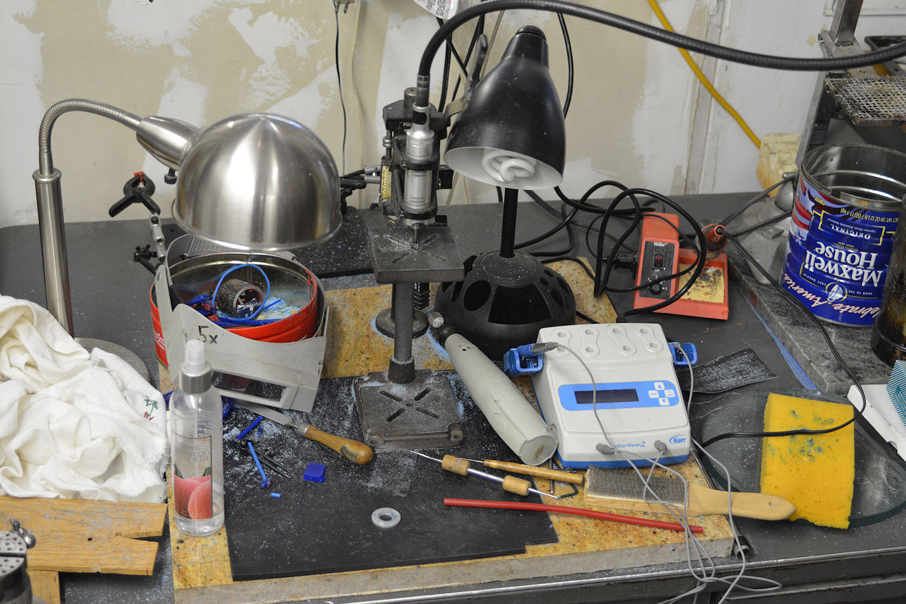 The bench in this photo seems a mess, and there is no actual model in the photo. I wanted to demonstrate how many tools and components are needed to simply create a very small piece, and how all of those are in very close proximity on the bench for easy reach. Most of the tooling can be identified, like the files and hand carvers, file card, and rotary tools. The device with the wires and the panel is a wax carving console, adapted from the dental industry for carving waxes for implants and stuff the dentists need. We owe a lot to the dental trade in lost wax casting; the high detail waxes and investment as well as tools we as sculptors and jewelers use come from their science and industry!