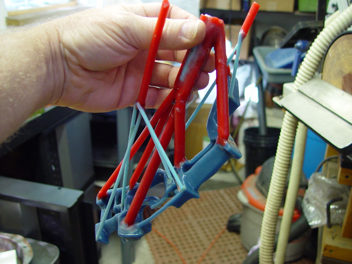 The actual object being cast is in the dark blue wax. The red wax rods are the heavier sprues, and the light blue wax rods are the vents. The molten metal will flow into the mold in the area where my fingers are holding it, and distribute through the tree of sprues into the model chamber. The displaced air will go up the small vent tubes and allow the metal to fill the cavity.