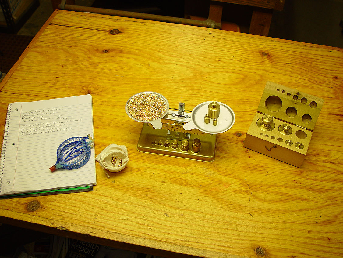 In this photo, I'm weighing bronze casting shot for a casting of the wax model that is laying on the spiral notebook. The wax is first weighed, and then a calculation using a constant factor of ratio between wax and bronze gives me an accurate amount of bronze required to replace the same volume of wax in the mold. For a small casting like this one, the beam balance is a useful tool for measuring this.