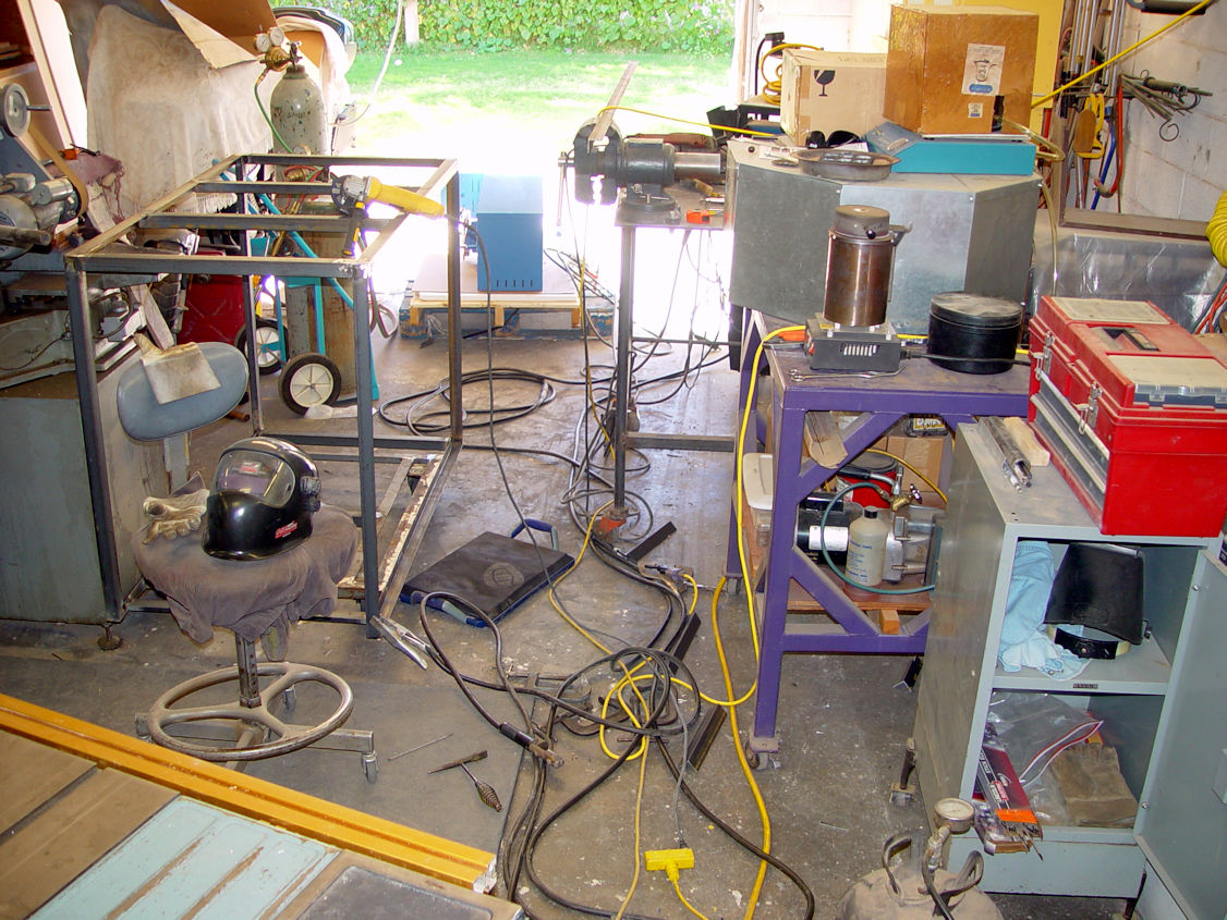 What a mess! How could anyone work in this nightmare? This is how real world welding looks, unfortunately, at least in my studio. The floor is cluttered with cables, cords, hoses, and equipment. The hood and grinder give an indication of the work, and the bottles, racks and clutter have a definite purpose! And it all gets cleaned up afterward.