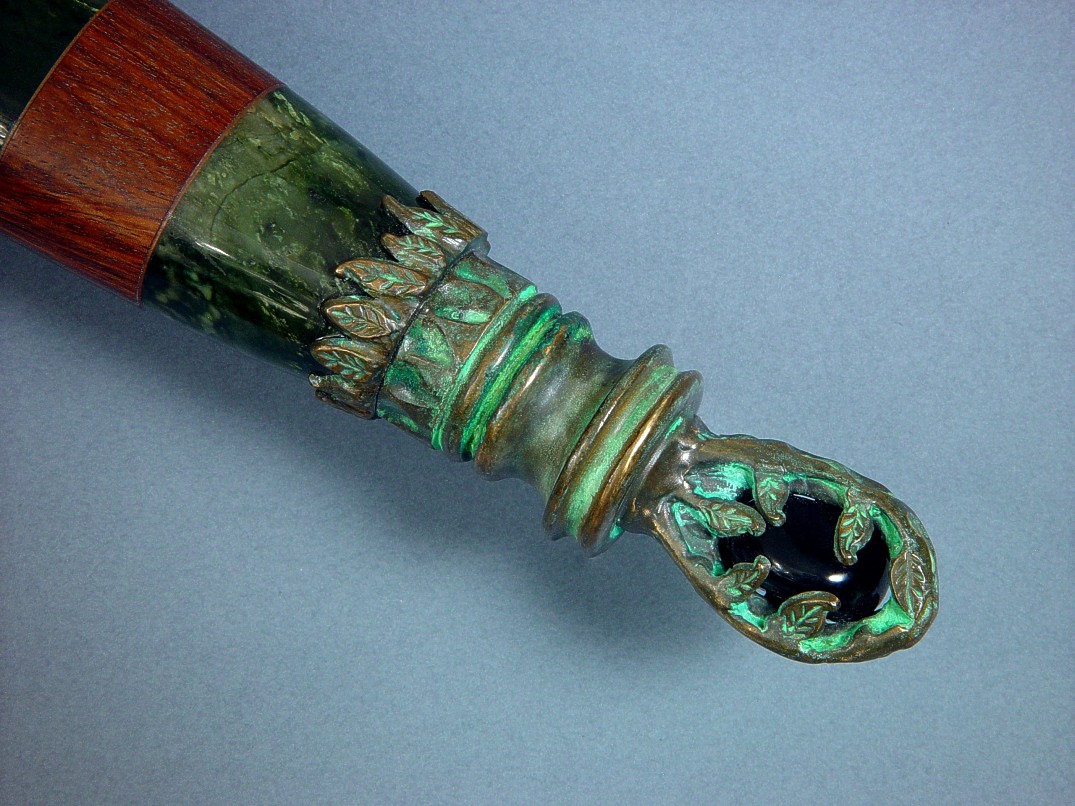Engraving bronze is like cutting butter, specifically compared to blade steels and 304 stainless steel, my most often-engraved material. In this particular instance, I didn't want a lot of high detail, more so I'm cleaning up and correcting the casting. I'm also cleaning up the little veins on the leaves of the small sculpture (which is what these castings are) and making just the right fit for the gemstone that will be placed in the pommel. Here is a link to the photo of the completed pommel, and here is a link to the page of the entire piece.
