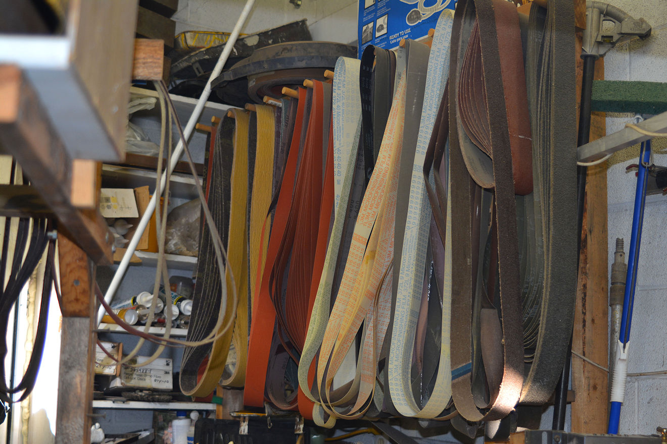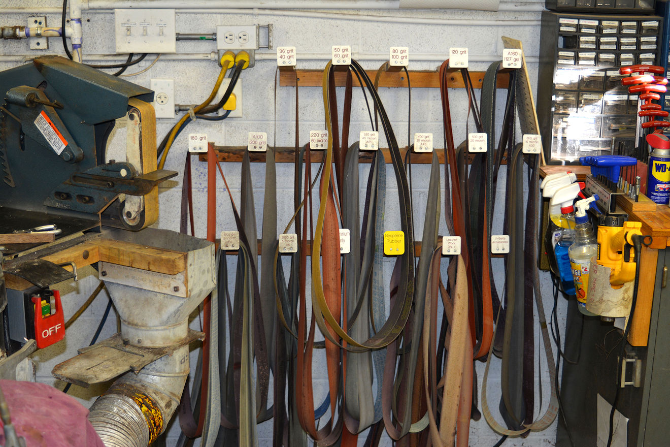 Once one understands that the very best blades are machined and ground (abraded) it becomes clear that the abrasives are a critical part of this process, and modern abrasives are highly sophisticated. Just take a look at information by the AES (Abrasives Engineering Society) and the UAMA (Unified Abrasives Manufacturing Association). To accurately and efficiently abrade and grind these sophisticated metals and other non-metal materials, the belt grinder must be outfitted with a wide variety of abrasives. The rack in the photo above is the working rack, simply the current belt set in use in the current job. To the right is a photo of the belt storage rack, with dozens of different types and grits. It's not uncommon to have hundreds of belts in the studio, both racked and boxed, and each one must be categorized, stored, and identified for its unique use and properties.