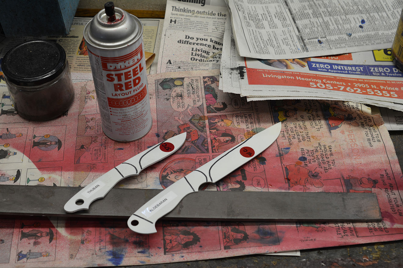 Blade blanks have to be cut out, and in my studio, this means dedicated and careful bandsaw work. In order for me to see the scribed line on the steel, I'll spray the billet with red layout dye before scribing. Why red and not blue? The laser on the saw is red, and a red line shows up brightly on a red dyed background, but almost disappears on a blue background.