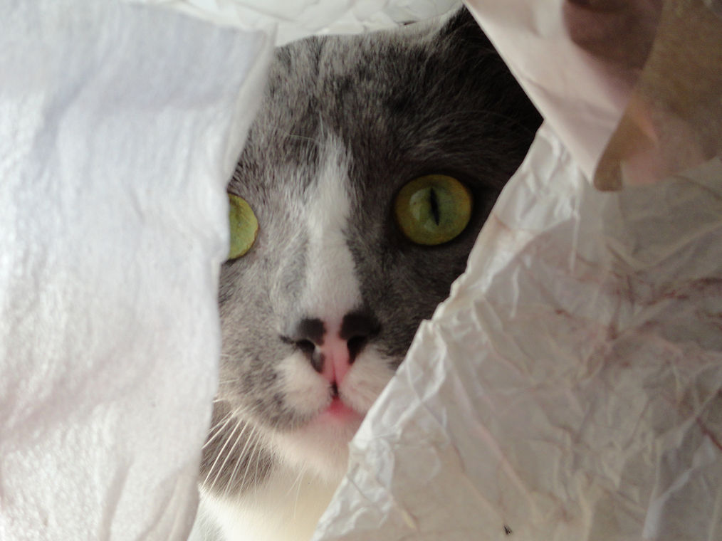 He's peeking through a bunch of wrapping. Cats seem to love boxes and wrapping, and can't wait to jump into them. He'll claim the new domain as his own, play a while, and then ignore the whole mess.