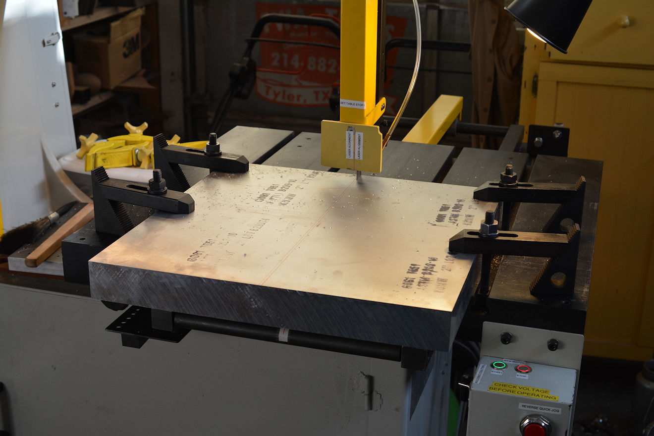 I started the build for the block quencher with an 18" by 18" by 2" thick slab of 6061 aluminum. Here, I'm cutting it in half to make the individual heat exchanger blocks that will be 9" by 18" and will be milled for the coolant passageways. This is the stock that you have already seen in the first "Shop" page series at this link.