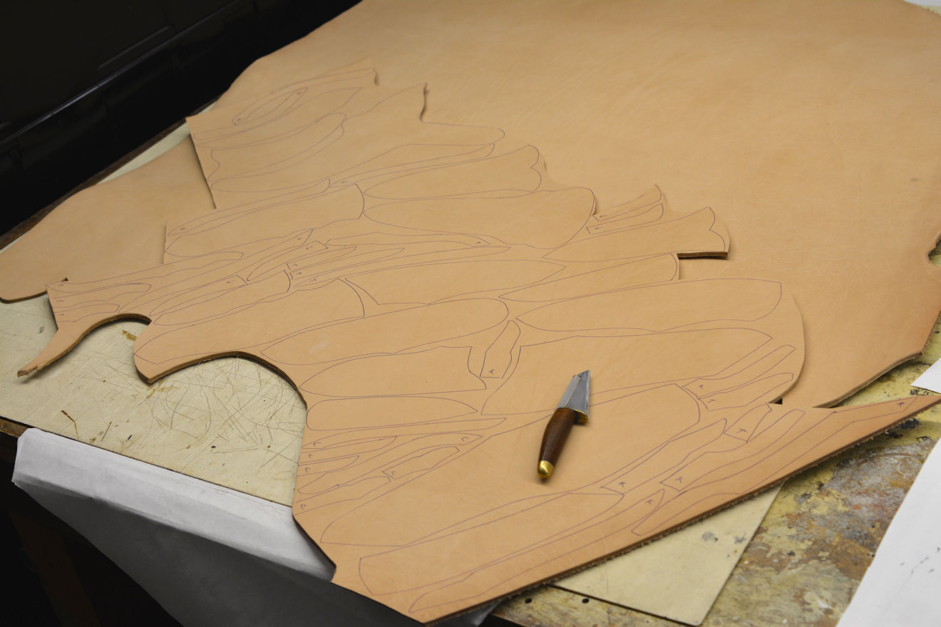 All leather sheaths start as tanned and processed, de-haired leather. In my sheaths, I almost always use 9-10 oz. thick leather shoulder. This is the shoulder of mature cows, and it's thick and strong, and stiff, and it's capable of taking and holding high detail tooling, carving, stamping, and dyes.