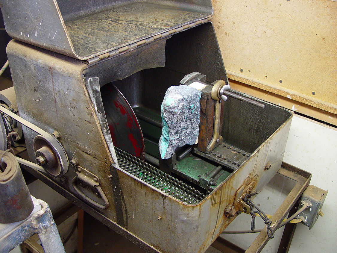 A block of turquoise from Mexico is chucked in the vise of the gravity-feed lapidary saw. This is a 10" saw (it has a 10" diameter blade), and it runs incredibly fast. How fast? The blade is zinging along at about 5000 surface feet per minute, or about 60 miles an hour. There is a balance in lapidary cutting between speed of the abrasive cut and the ability to carry the coolant fluid into the cut and the ability to wash grit (cut stone) from the cut trough.