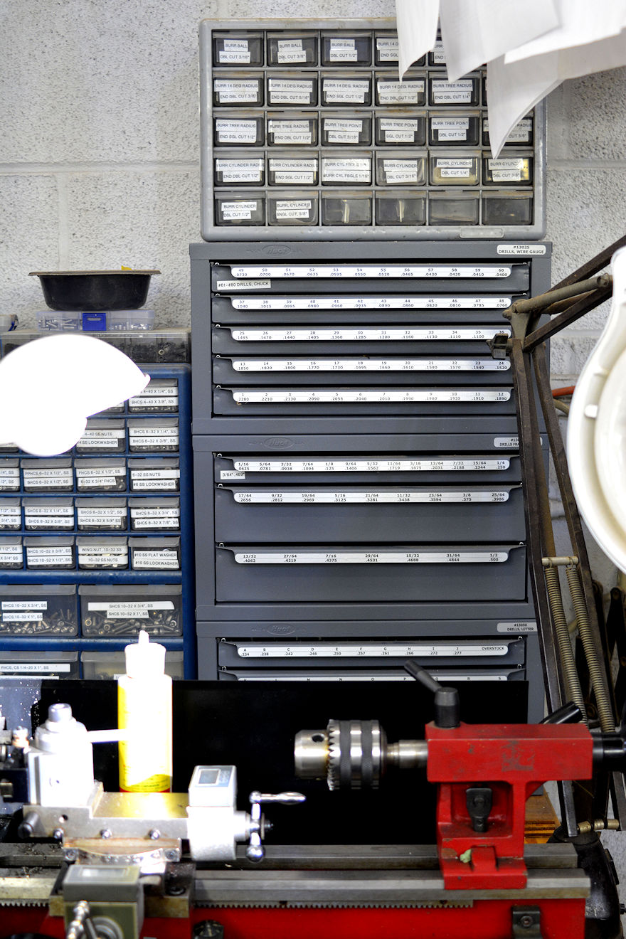 You are going to see a lot of organization in my studio and shop. There is no way to work with such a wide variety of materials and techniques and not have an organized way to function, all the way down to the tiniest drill bit (#80 or .0135").