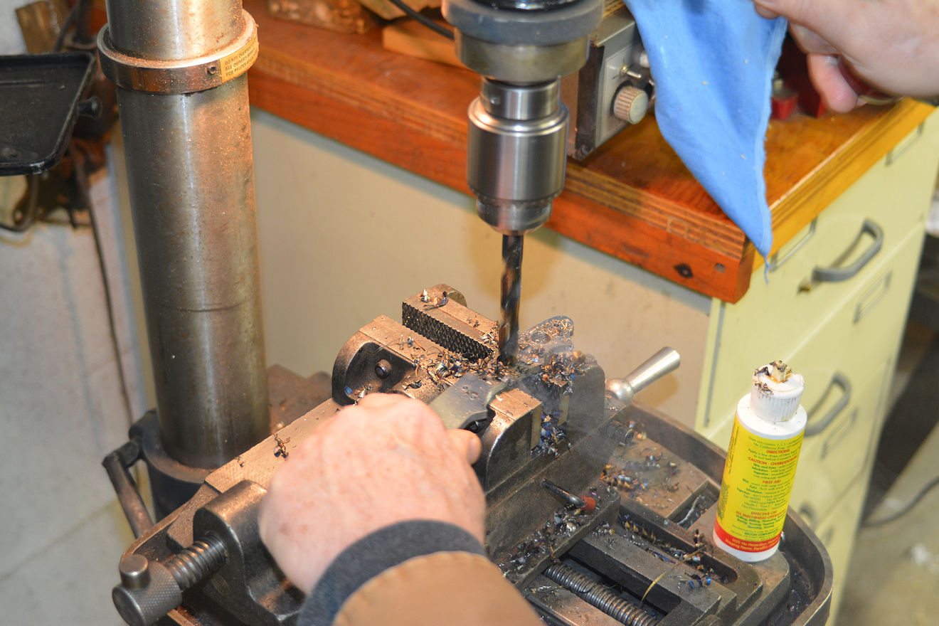 By the way, you'll often see that holding onto the work while drilling is a very bad practice; for safety it's usually recommended that the work is clamped. But if you are well-experienced, and can judge when the bit is about to break through the work, and are a knifemaker in constant production, your hands can easily control this operation. But I would not advise this for the novice. This is one of those things where 40 years of practice and experience helps.