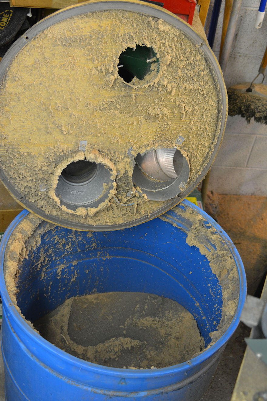 Here's the dust collector reservoir ready to empty. This is how much stuff it collects in 3-4 years, and it's a lot. When I first started using it, it was so full that I couldn't move the barrel, and had to move it to the dumpster with a hand truck and empty it with a shovel and a bucket. In our location, the trash all has to be in a plastic bag as well.