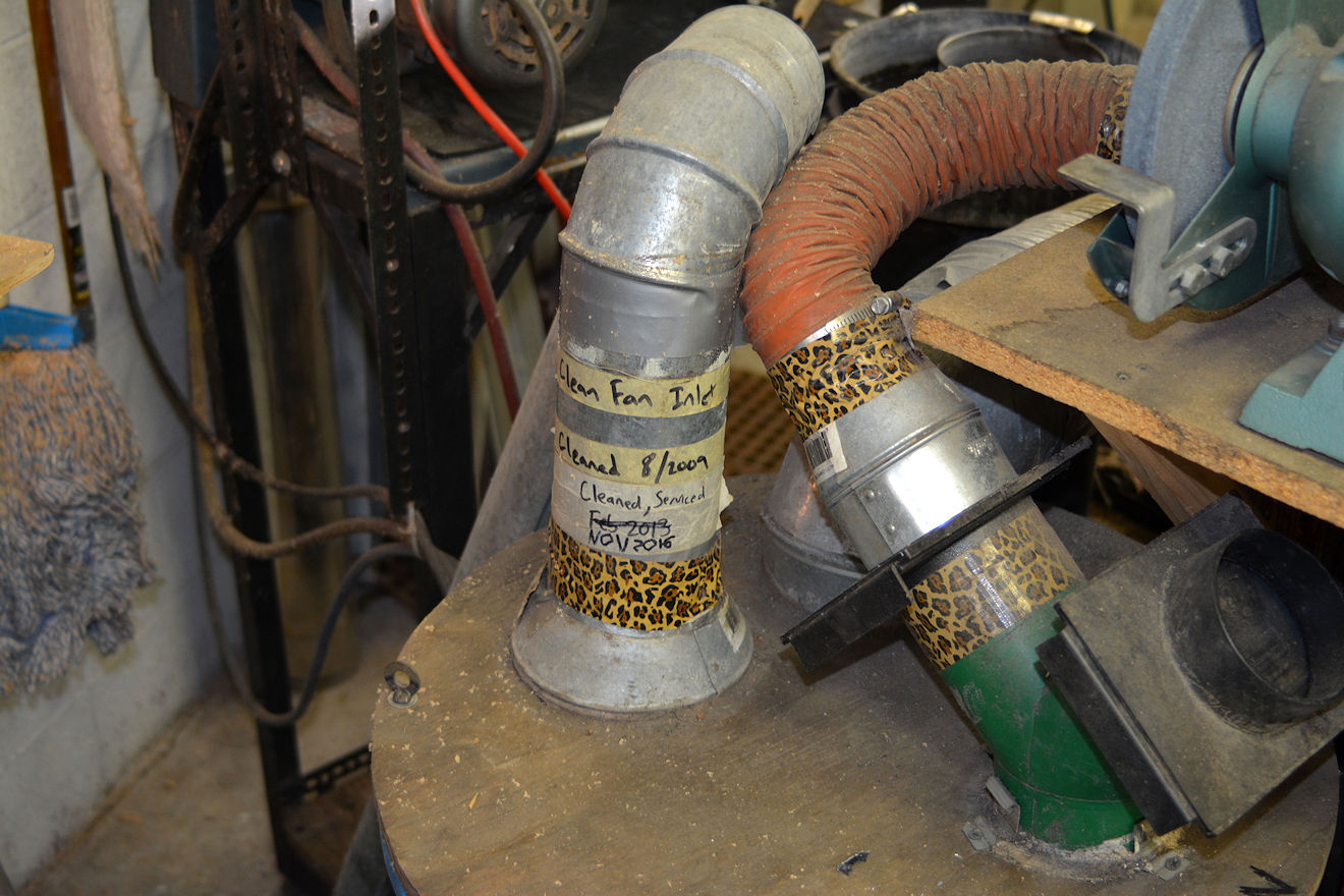 What you see in this photo is the plywood top of a 55 gallon plastic drum, the kind used to store and transport chemicals. The inlet port to the collector fan has tape on it with a note of when it was last cleaned. You can see that I clean it every 3 or 4 years. The decorative duct tape is a nice touch.