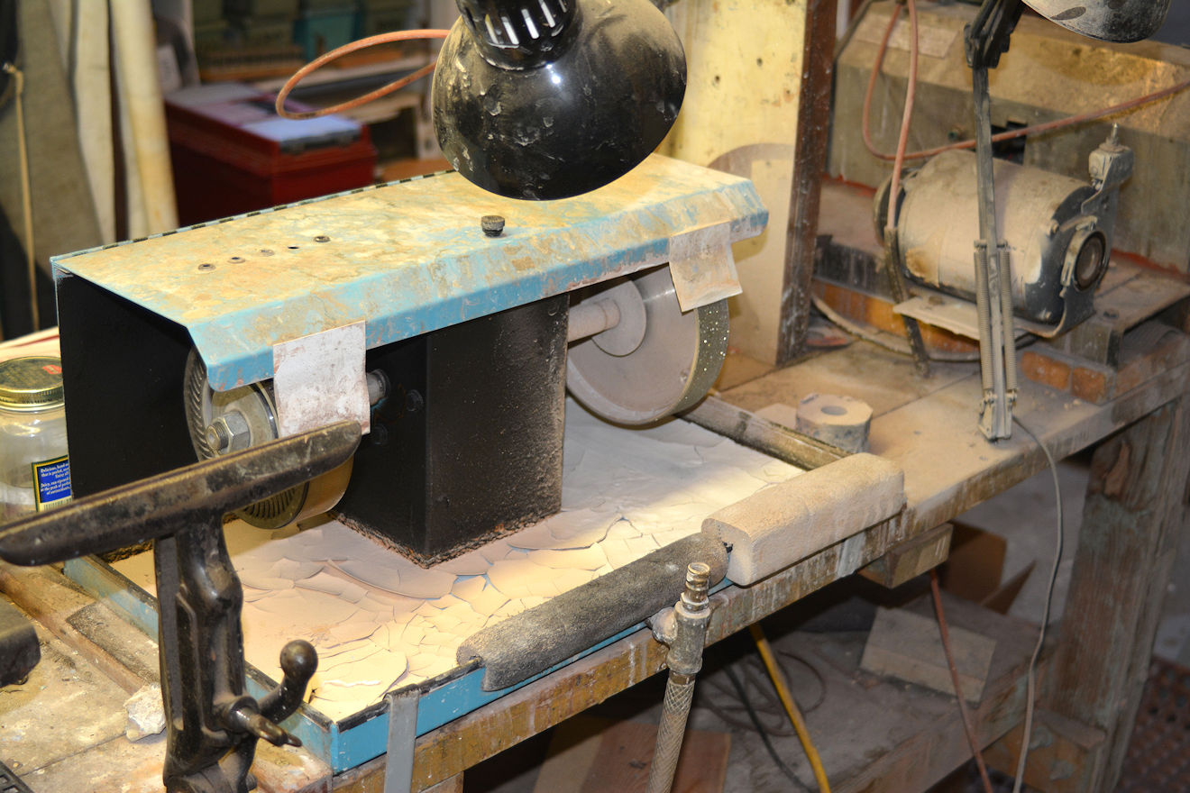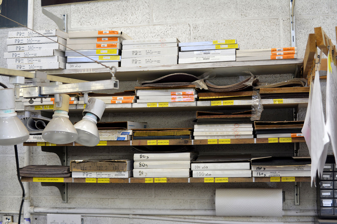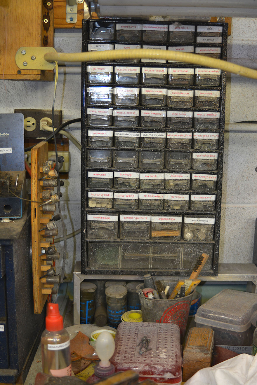 At the bottom of the photo, you can see various abrasive compounds, small tool dispensers, and marking, cleaning and rubbing tools. Always present is the container of denatured alcohol which has dozens of critical uses in the studio.