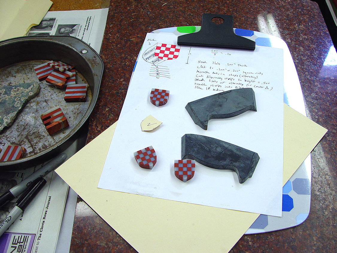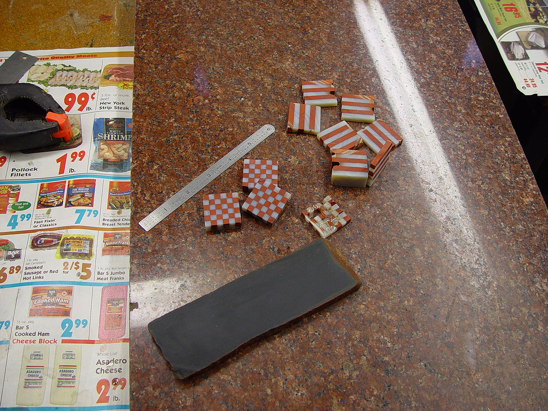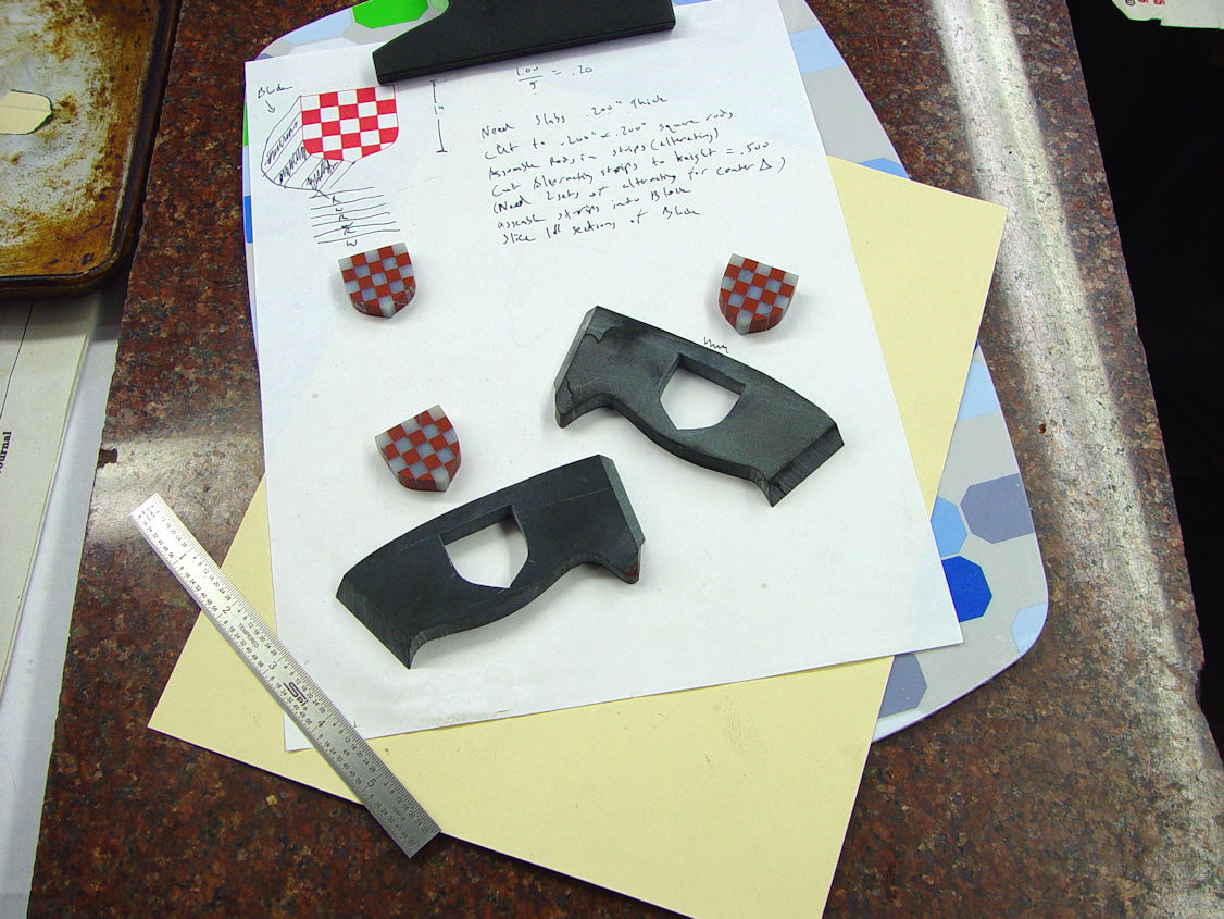 After lapping the slabs to extremely close tolerances, they are assembled and then cut again, reoriented and assembled using a jeweler's grade epoxy into the checkerboard. Then, they are sliced again to get the two slices I would need for the inlays. The black jade is at the bottom of the photo.
