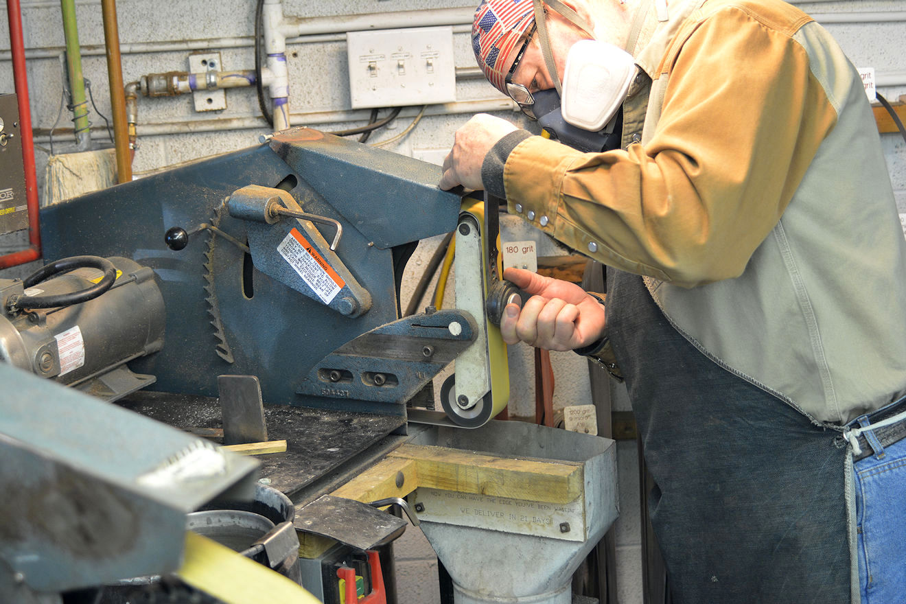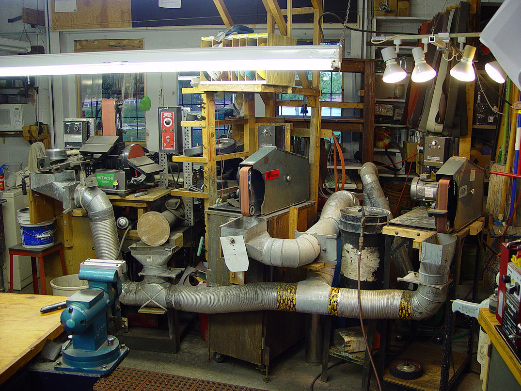 The ventilator is critical when working with solvents, dusts, or polishes and you can see the containers and tools for those on the bench. Vapors and dust accumulate constantly in the knifemaker's shop, and control at the source is the first and best preventative.
