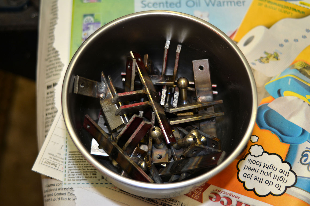 I make these ball joints one at a time, by hand, and they are all made of 304 stainless steel. They have very specific clearances and angles, and there really is no manufactured item that comes close to this assembly. When I work on them, I'll build a group, perhaps a dozen or more, to save time on setups. Here is a small container of a group that have been cut, welded, turned, and threaded and are ready for assembly and dressing.