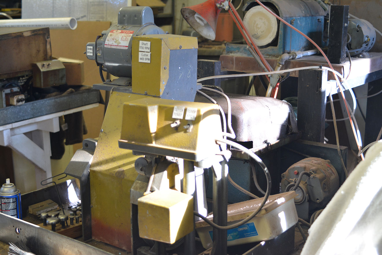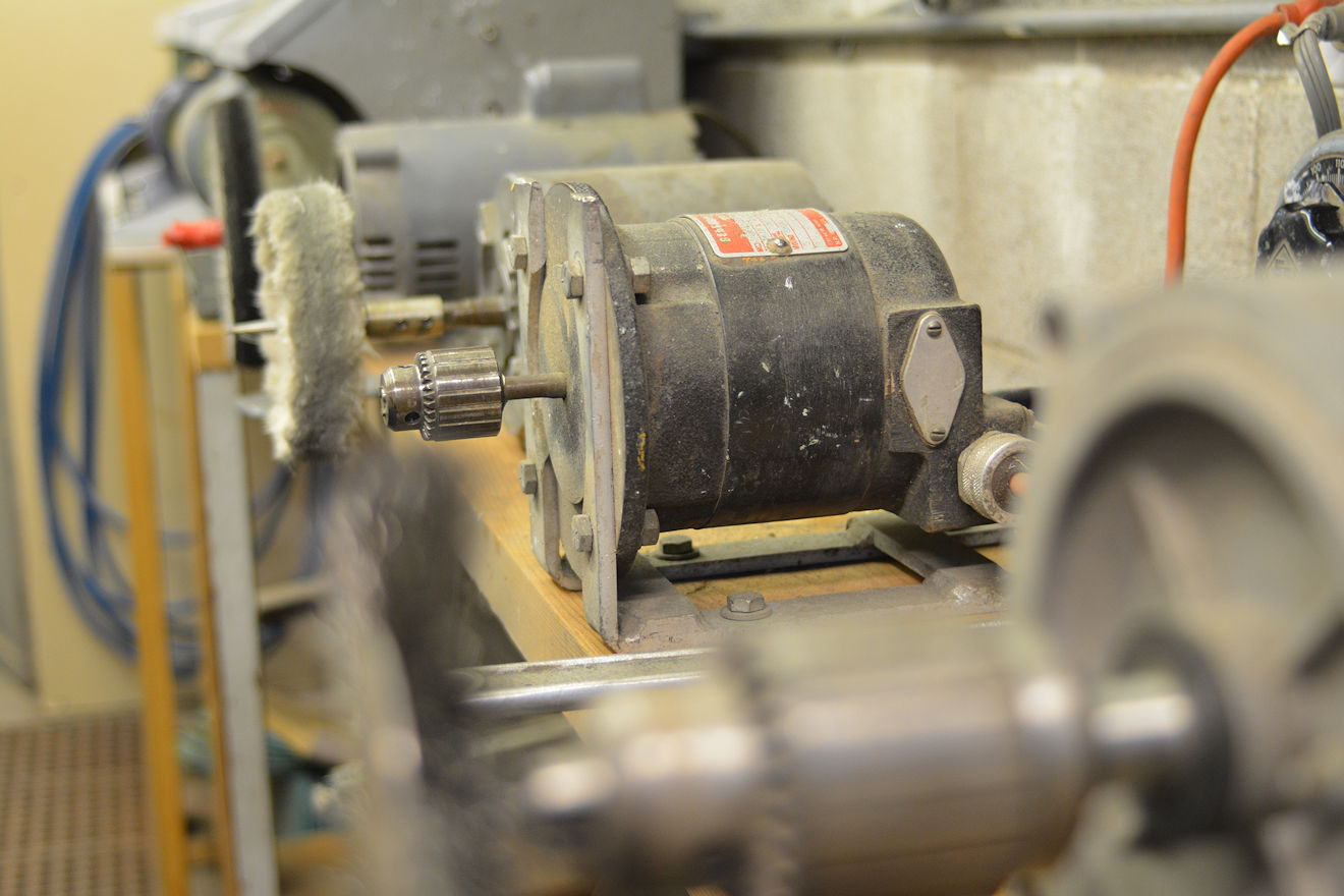 The shop is filled with electric motors. The center of focus in this photograph is the black 5000 rpm high speed motor. This is an unusual animal; a direct current brush motor that is shunt wound, and is 1/10th of a horsepower. It maxes out at 125 volts. You can see the Variac (variable rheostat) at the right edge of the photo, which has a bridge rectifier to convert the alternating current to direct current.