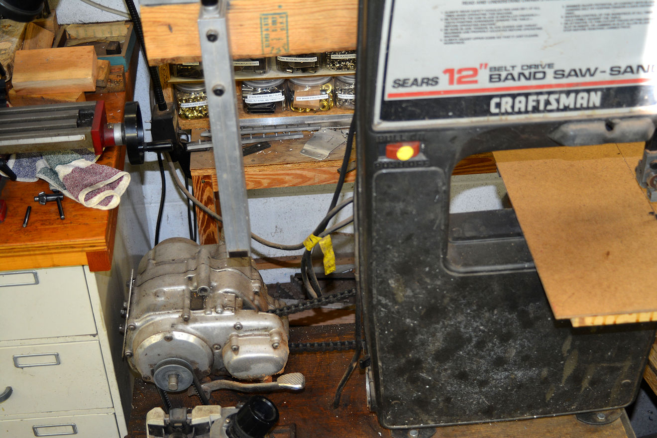 For those of you who know about these things, you'll realize that very seldom are machines capable of the incredibly high rate of speed required to accurately and properly cut wood (around 3000 feet per minute) and also cut metal (typically around 100 feet per minute for ferrous metals). It takes quite a speed reducer to change from high speed to low, and the one Sears offered had nylon-toothed gears with several toothed belts and a chain, and changing between wood and metal was cumbersome. So after the speed reducer wore out several times, I said to myself, "What I need is a transmission for this saw!"