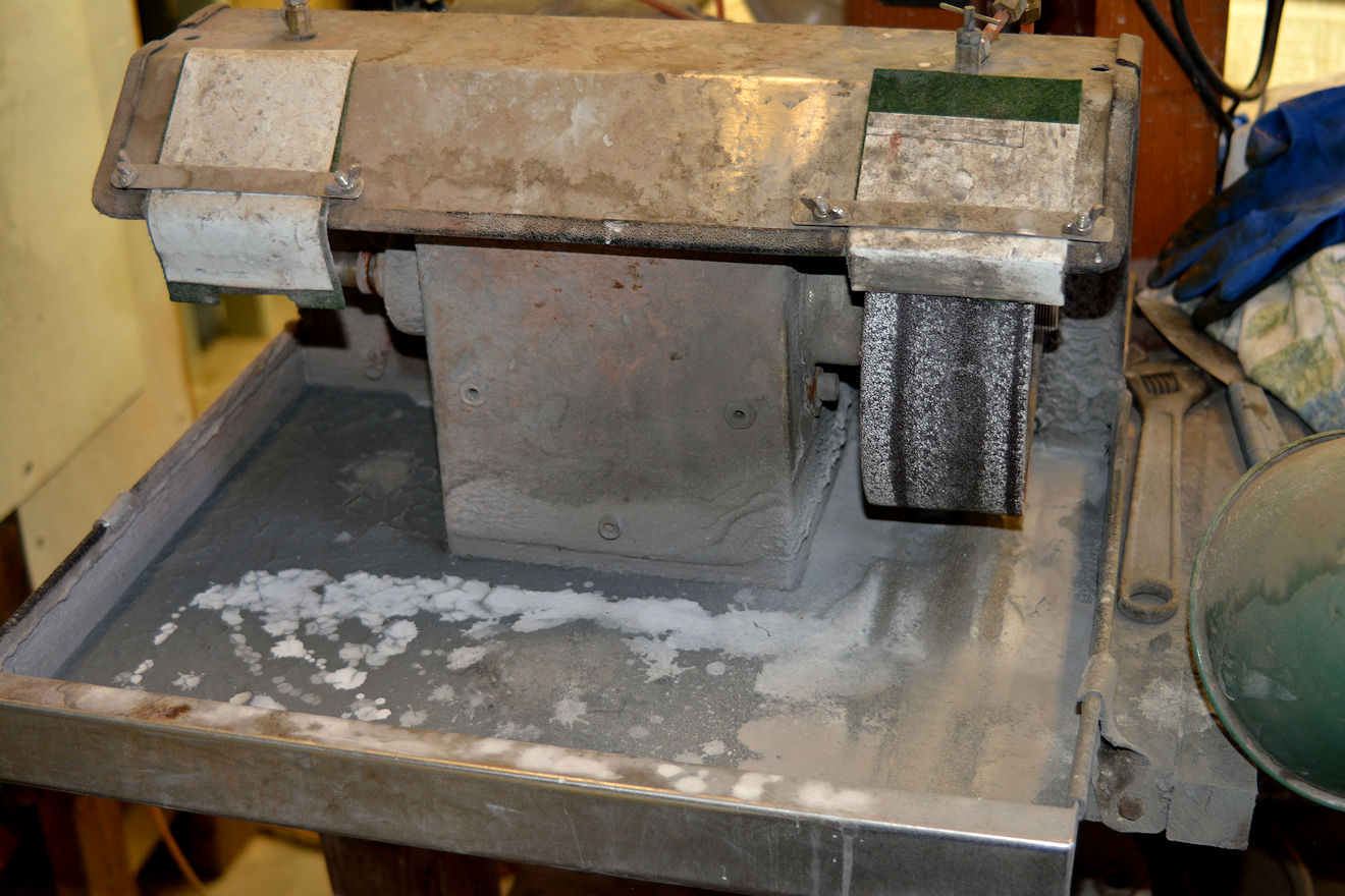 This particular unit is all stainless steel, which is a great thing. Painted steel lapidary arbors only last about 4 years when the bottoms rust out. The bottoms (sumps) always have standing water with a mixture of grit, rock dust, and compounds, and it makes no sense to clean these units. Apart from scooping up heavy debris in the sump, wiping them down is a fruitless endeavor, since they will be covered in the stain of use at the next job. This is why in functional lapidary shops these units always look dirty. Grinding and sanding rock is a very dirty affair, after all, you are making dirt (ground up rocks) from stone.
